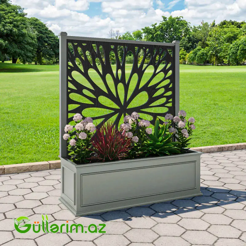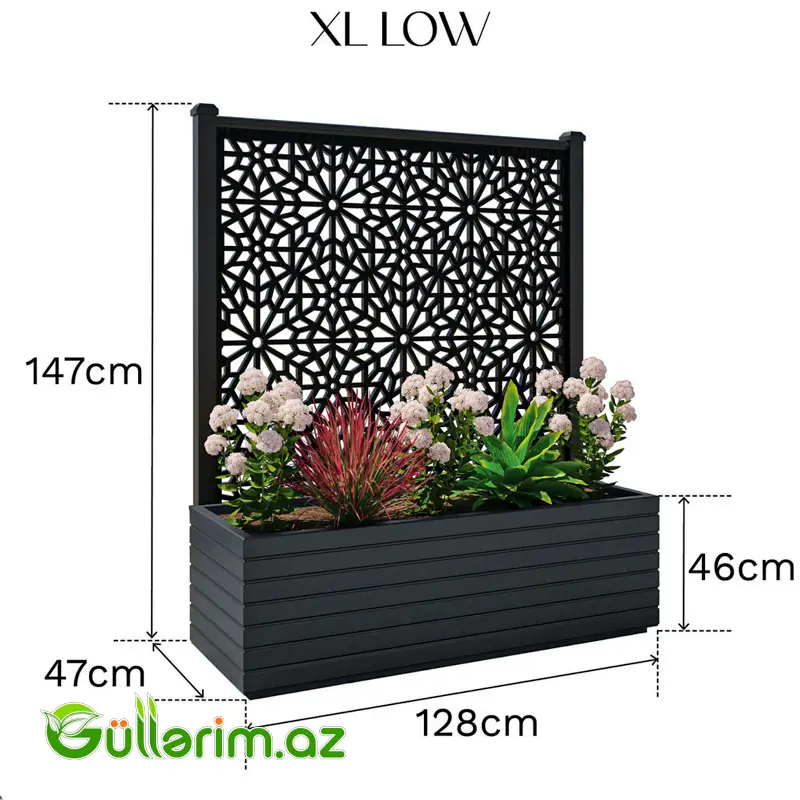 Bu model – Windsor Extra Large Low Planter – sənin istehsal etdiyin metal karkas + DIKT (kontrplak) gövdə konstruksiyası əsasında hazırlanmış premium dekorativ dibçək və dekor screen panelindən ibarət müasir dizaynlı sistemdir.