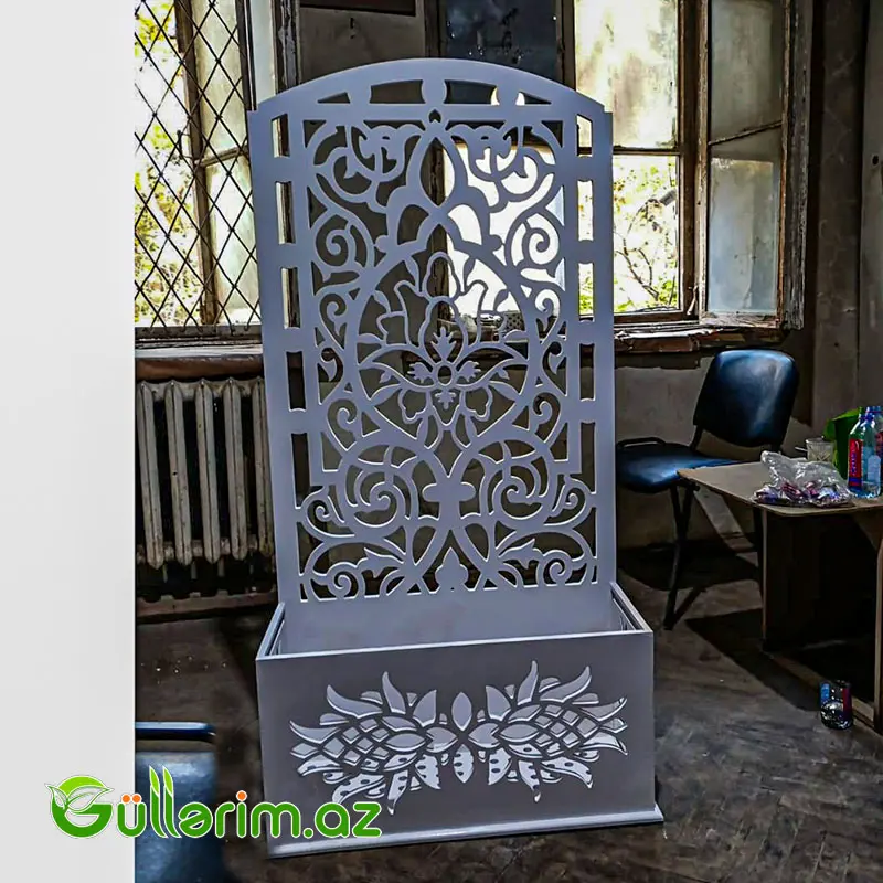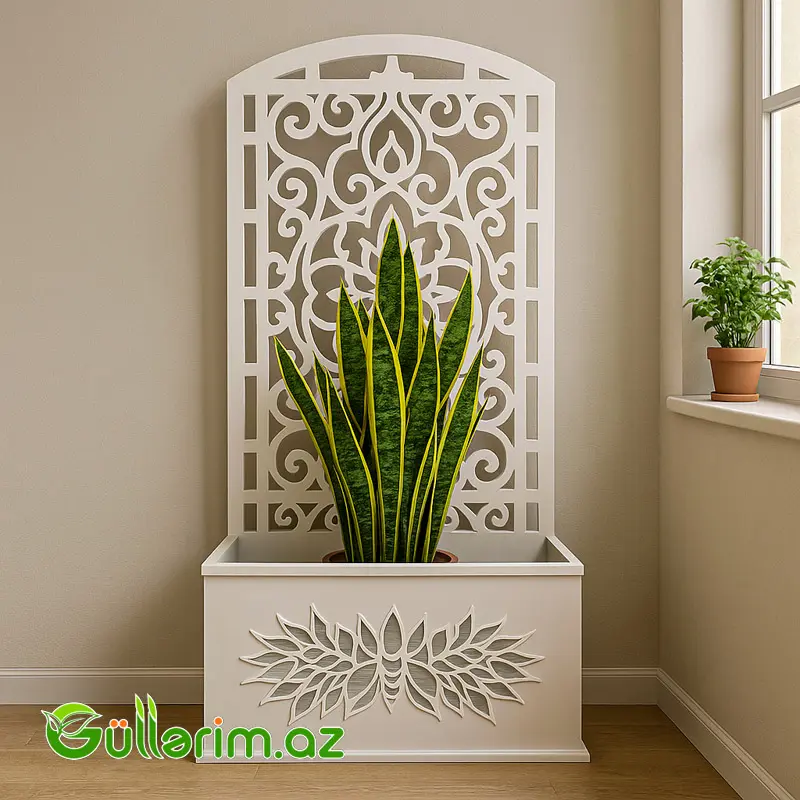 Bu dekorativ dibçək MDF (taxta əsaslı panel) materialından xüsusi lazer kəsim texnologiyası ilə hazırlanmış modern və zərif ornament dizaynı ilə seçilir. Arxa hissəsindəki dekorativ screen paneli həm məkanlarda estetik görüntü yaradır, həm də bitkilərin fonunu vurğulayaraq daha harmonik vizual effekt təmin edir.