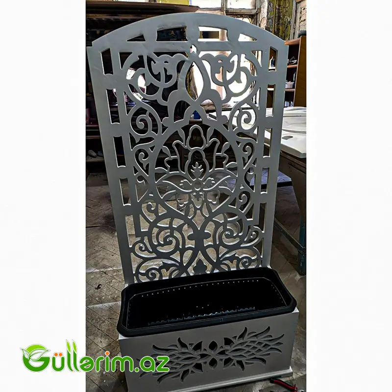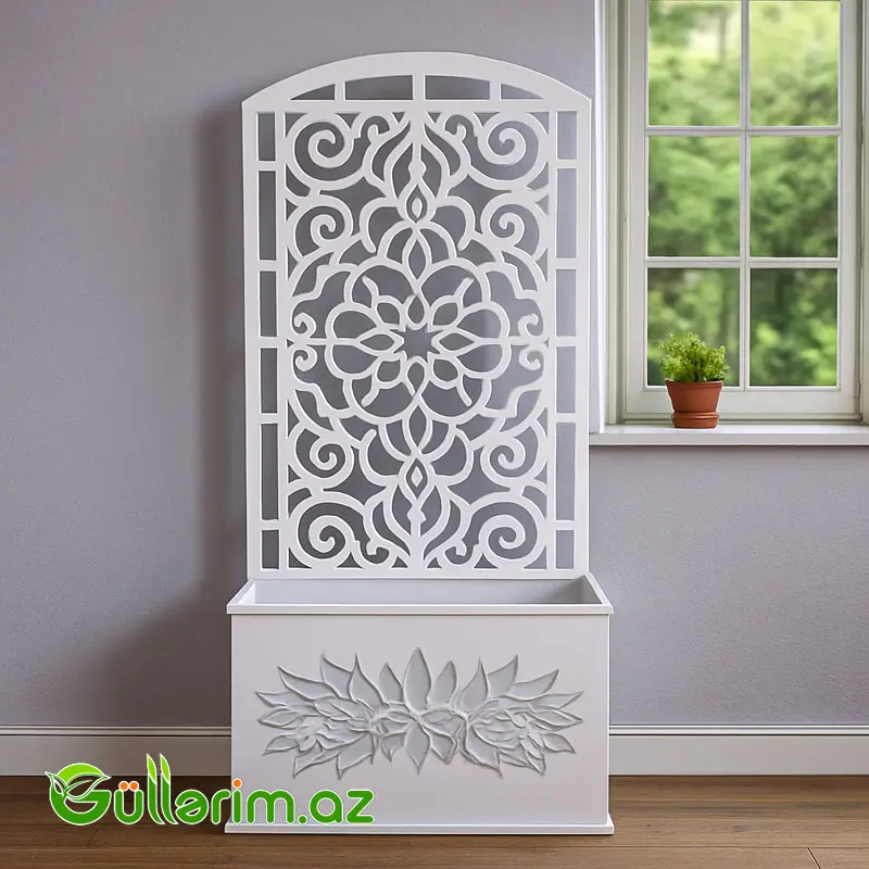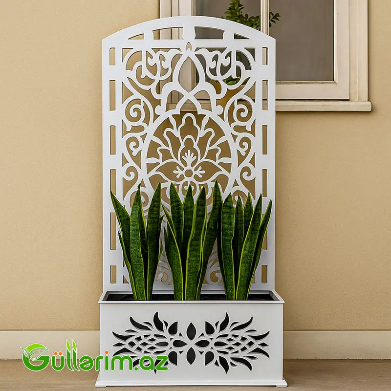 Bu dekorativ dibçək MDF (taxta əsaslı panel) materialından xüsusi lazer kəsim texnologiyası ilə hazırlanmış modern və zərif ornament dizaynı ilə seçilir. Arxa hissəsindəki dekorativ screen paneli həm məkanlarda estetik görüntü yaradır, həm də bitkilərin fonunu vurğulayaraq daha harmonik vizual effekt təmin edir.